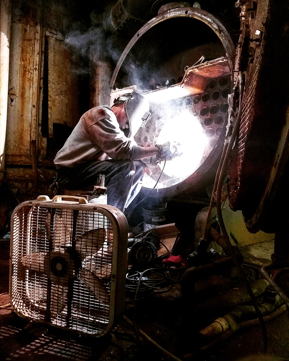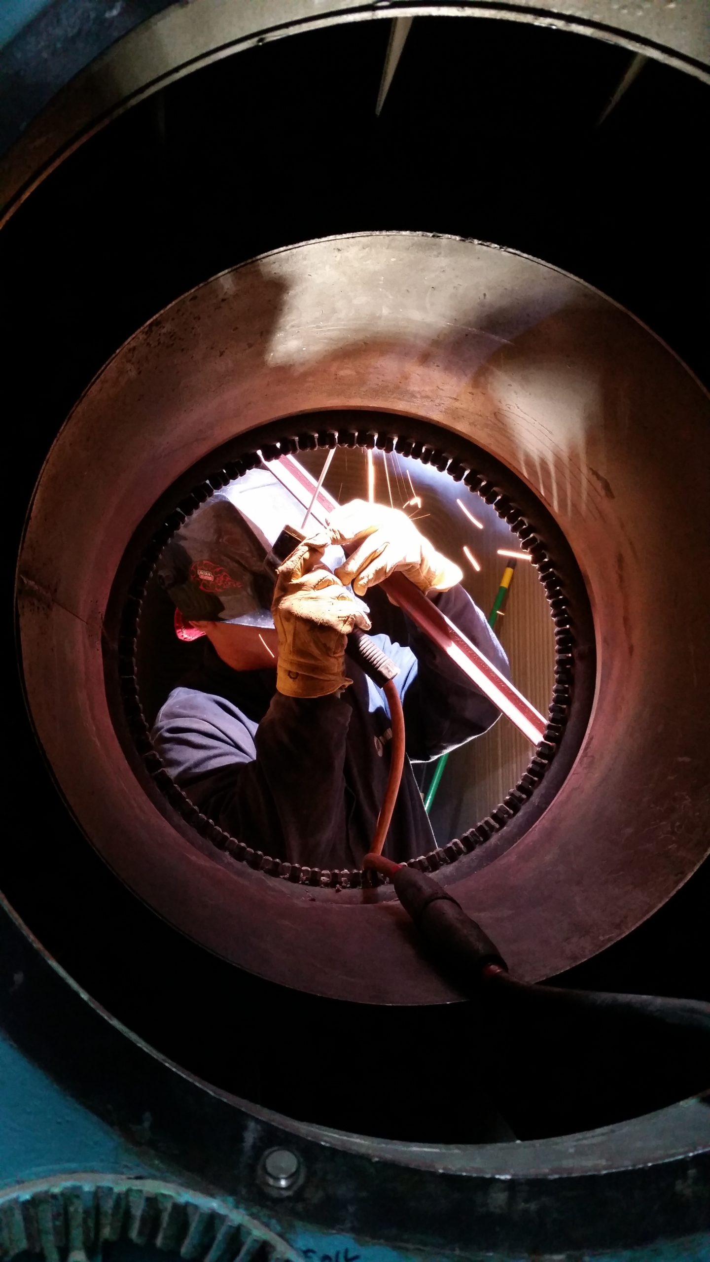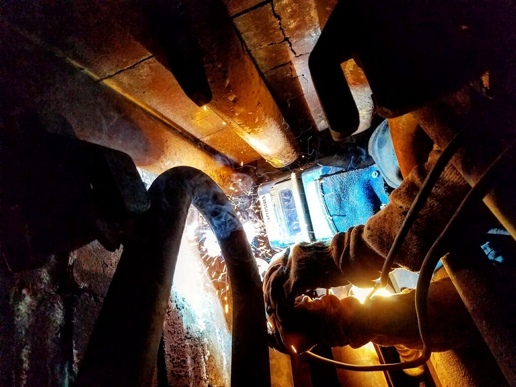 Vince, one of our welders from our Washington office, He had to wedge himself under a row of tubes in one of their giant water tubes to weld on a bend.